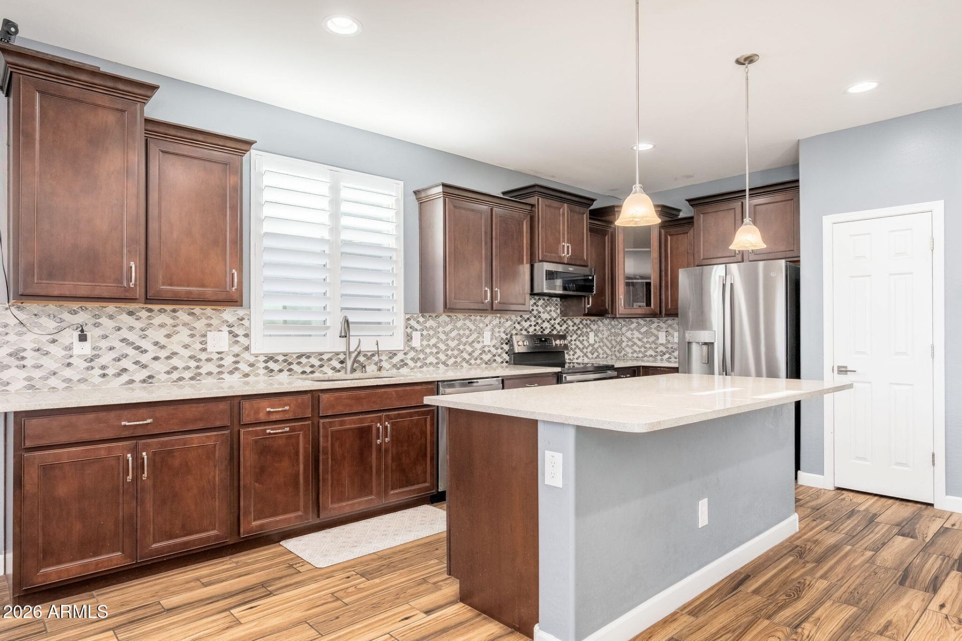 Gorgeous, move-in ready, upgraded 2020 home with everything on your buyers wish list! As you enter you will love the porcelain tile flooring, plantation shutters, and the wide open great room that is perfect for gatherings. The kitchen serves as a true centerpiece featuring a spacious middle island, matching stainless steel appliances, quartz countertops, mosaic tile backsplash, wood cabinets with crown molding and a walk-in pantry. The primary suite is the perfect retreat with a soaking tub, shower, dual sinks, and a walk-in closet. In the private backyard oasis the new, sparkling pool takes center stage, offering an ideal space to cool off on warm, summer days while the surrounding low-maintenance turf provides a lush, green space. Walking distance to the neighborhood park & playground