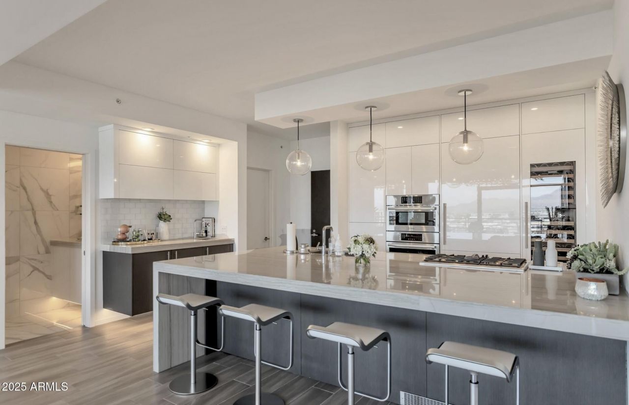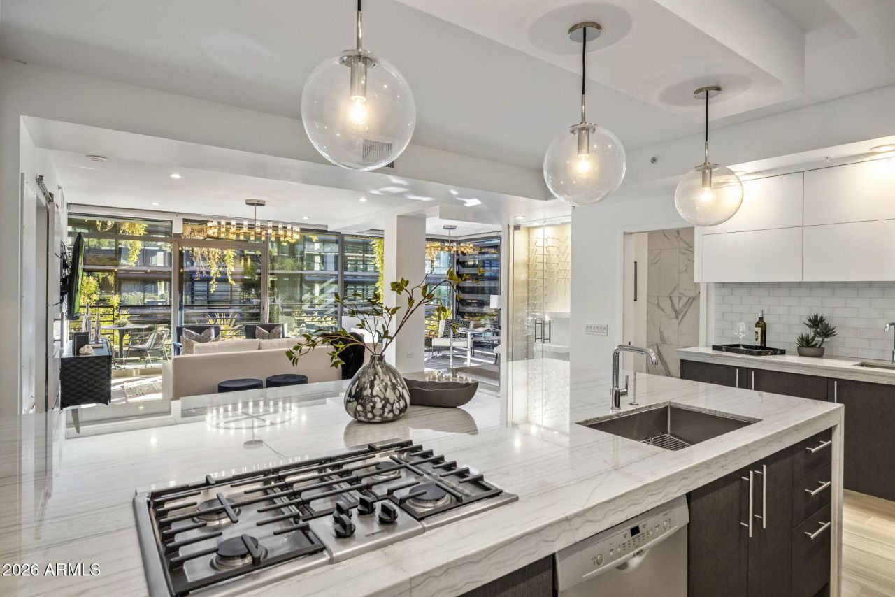Rare 9th-floor executive condo in Optima Kierlands boutique 7120 building with penthouse-level finishes. This exceptionally oversized 1-bedroom + den???one of the largest and rarest 1-bedroom floor plans???was thoughtfully converted from a two-bedroom to enhance scale, light, and livability. Light-filled interiors capture northeast mountain corridor views and serene courtyard vistas. The chefs kitchen features an oversized quartzite waterfall island w/ seating for four, expansive custom cabinetry, Sub-Zero fridge/freezer + full wine fridge, Bosch gas range w/ pop-up exhaust, & wet bar. Versatile den with custom closet functions as office or guest space. Additional upgrades include a striking three-gas way fireplace, wine wall, custom lighting and closets. 24-hour (see more for amenit Optima Kierland 7120 Amenities Include:24-hour manned, secured buildingUnderground secured parkingResort-style rooftop pool, daybeds, cold plunge & saunaBBQs & fitness centerGolf simulatorCommunity room for partiesConcierge servicesBasketball, pickleball & squash courtsBocce ball & dog parkResident lounges & lush garden courtyards