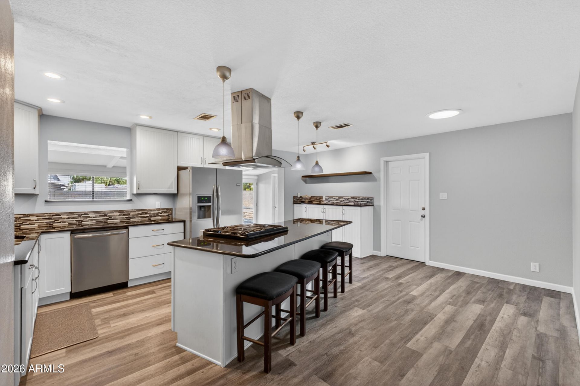 Welcome to this 5 bedroom, 2 bath home in Tempe, just minutes from ASU and Tempe Town Lake, offering space, comfort, and great value. A private front porch greets you and gives a nice place to relax. Inside, enjoy both a family room and a living room, giving you room to spread out and gather. The eat-in kitchen is bright with white cabinets, granite counters, and a gas stove, making it a great place to cook and enjoy meals. Grey wood-look vinyl flooring runs throughout the home for easy care and a clean look. The primary bedroom includes a bonus room that works well as a home office, along with a large walk-in closet and a walk-in shower. The other bedrooms are roomy, and there is an extra bonus room with a cozy fireplace for added comfort. The backyard is low maintenance with turf and a firepit, and it offers plenty of space to design your own outdoor oasis. This home is a great fit for a primary home or an investment, with a prime location close to schools, dining, and entertainment, making it a must-see in Tempe.