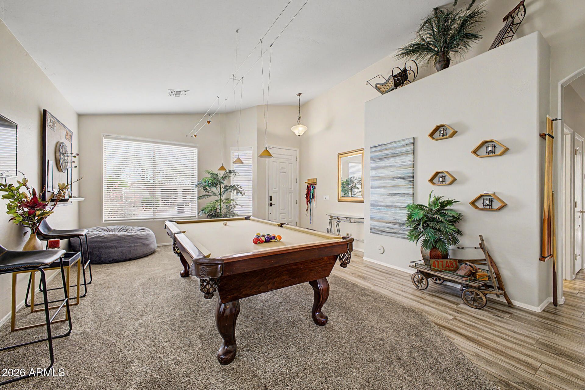 Welcome to this beautifully maintained north/south facing home located in one of Mesas most desirable neighborhoods. This 4 bedrooms property also features a verstile bonus room with convenient bathroom access-ideal for guests, a home office, or flex space. The home offers both a formal living room and a spacious great room with a cozy fireplace, providing multiple areas for relaxing and entertaining. The primary suite offers a private retreat with a spa-inspired ensuite remodeled in 2025, and features a walk-in shower with dual shower heads. Garage includes built-in storage and a service door from the garage leading to a side yard dog run. Backyard is designed for enjoyment with a covered patio, landscaped yard, and heated spool(pool/spa), for year round use.