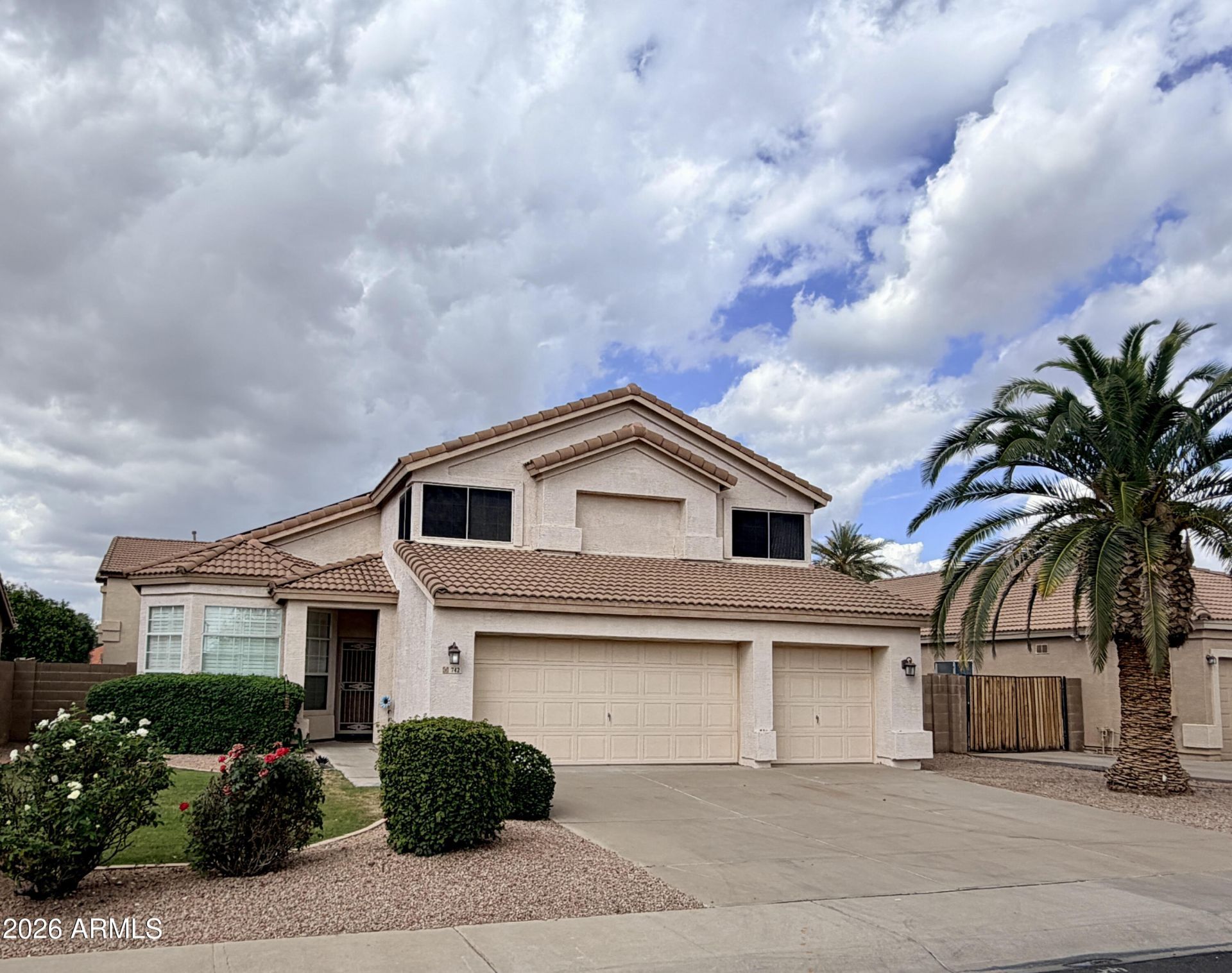 Welcome home to Vista Estancia, a sought-after Gilbert neighborhood known for its quiet charm and easy access to DANA PARK shopping and dining, and top-rated schools. This well-designed 4-bedroom, 3-bath home with a den and spacious loft offers flexibility for modern living, plus a 3-car garage and sparkling private pool for enjoying Arizonas sunny days. The rare floor plan features the primary suite and an additional en-suite bedroom/ bathroom with large walk-in closet downstairs, perfect for guests or multi-generational living. Upstairs, youll find two more bedrooms, another full bath, and a huge loft ideal for a playroom, home gym, or media space. The kitchen is the heart of the home with granite countertops, upgraded cabinetry, gas cooking, and both bar seating and a bay-window dining nook. Thoughtful updates include TWO NEW AC UNITS, vaulted ceilings, wood shutters, fresh new paint throughout, and energy-saving solar to keep utility bills low year-round. The low-maintenance backyard features a covered patio overlooking the gas heated pool with a variable-speed pump, ideal for summer gatherings or evening relaxation.Nestled near Val Vista & Guadalupe, this home offers easy freeway access, nearby parks, and award-winning Gilbert Unified schools including Patterson Elementary and Mesquite Junior High.Move-in ready, beautifully maintained, and priced to sell--this Gilbert gem is the perfect blend of comfort, convenience, and desert living.
