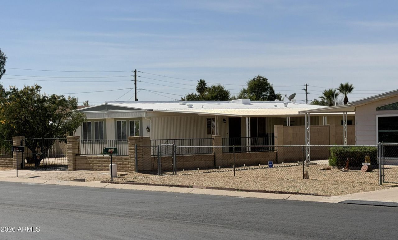 Fantastic Opportunity in the 55+ Community of Arizona Skies! Dont miss this charming home featuring two spacious primary suites, perfectly situated on a desirable corner lot. The fully fenced property offers added privacy, a covered carport for convenient parking, & easy-care landscaping for low-maintenance living. Inside, the inviting living room showcases a calming color palette, stylish laminate flooring & lots of windows creating a warm & comfortable space to relax or entertain. The well-appointed kitchen is designed for both function & style, featuring solid surface countertops, bright white cabinetry, SS appliances & a pantry for extra storage. The first primary suite includes a private bathroom with dual sinks, offering both comfort & efficiency for everyday living. The second... primary suite also features its own ensuite bathroom, making it perfect for guests or roommates. Step outside to the oversized backyard, ideal for enjoying Arizonas beautiful weather. The space includes a large, covered patio, multiple storage sheds in the back, an expanded storage area off the carport complete with workbench & plenty of room to create your dream outdoor retreat--whether thats a garden, entertaining area, or peaceful relaxation space. This home combines comfort, convenience & great outdoor living in a welcoming 55+ community. Upgrades include, roof 2026, HVAC 2022, bath 2025 & many more.