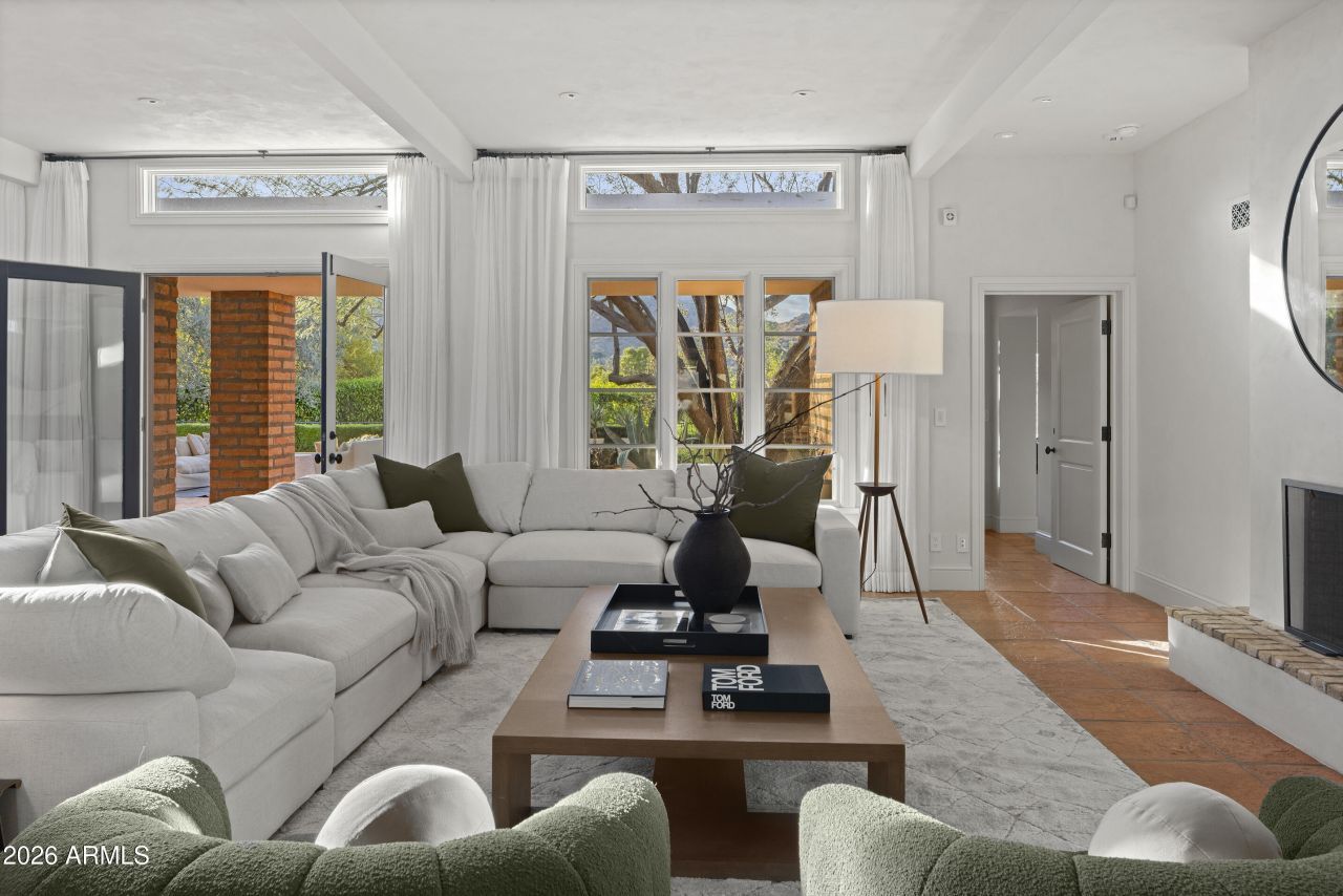 A rare offering on the 4th fairway of Paradise Valley Country Club, this 6604 sf desert/modern - extensively remodeled (GM Hunt 2013) estate blends timeless character with a refined modern edge. Highlighting a private courtyard pool, the home features Saltillo and wood floors, floating beam ceilings, and restored antique doors. Framed by views of Mummy Mountain in the front and the Phx Mountain Preserve beyond, the home sits along the golf course, offering a picturesque setting. The backyard is designed for both entertaining and everyday living, w/multiple patio spaces, expansive lawn, mature trees, and a curated vegetable garden. The primary suite features vaulted ceilings, a spacious bathroom, 2 water closets and large dressing room. The reimagined kitchen showcases mid-century modern... influence with Viking appliances, double ovens, a prep kitchen, and ample storage. Multiple living areas open seamlessly to lush grounds with olive and citrus trees, grass, and a brick patio w/ firepit. Three additional bedrooms, an office/library, 4 car garages + flexible spaces offer versatility. A warm, architecturally rich property in one of Paradise Valleys most coveted locations.