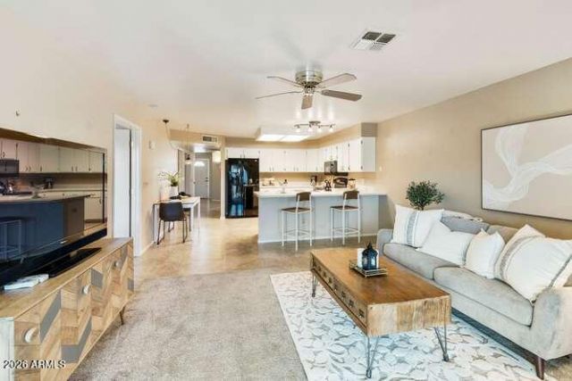 Enjoy easy living in Sunland Village East Garden Condos, a desirable 55+ community. This 2-bedroom, 2-bath split floor plan townhome features new windows installed in 2024 for quiet comfort and energy efficiency, plus a newer Carrier 3.5-ton AC (2024). The bright kitchen offers a breakfast bar, new microwave, and new garbage disposal. Spacious living and dining areas provide room to relax or entertain. The generous primary suite includes a walk-in closet, double vanity, and remodeled shower. Ceiling fans throughout add comfort. The oversized 1-car garage offers abundant storage. Exterior was painted this year, and the HOA maintains the exterior and yard for easy lock-and-leave living. Private outdoor space is perfect for grilling or enjoying Arizonas beautiful weather. Move-in ready!