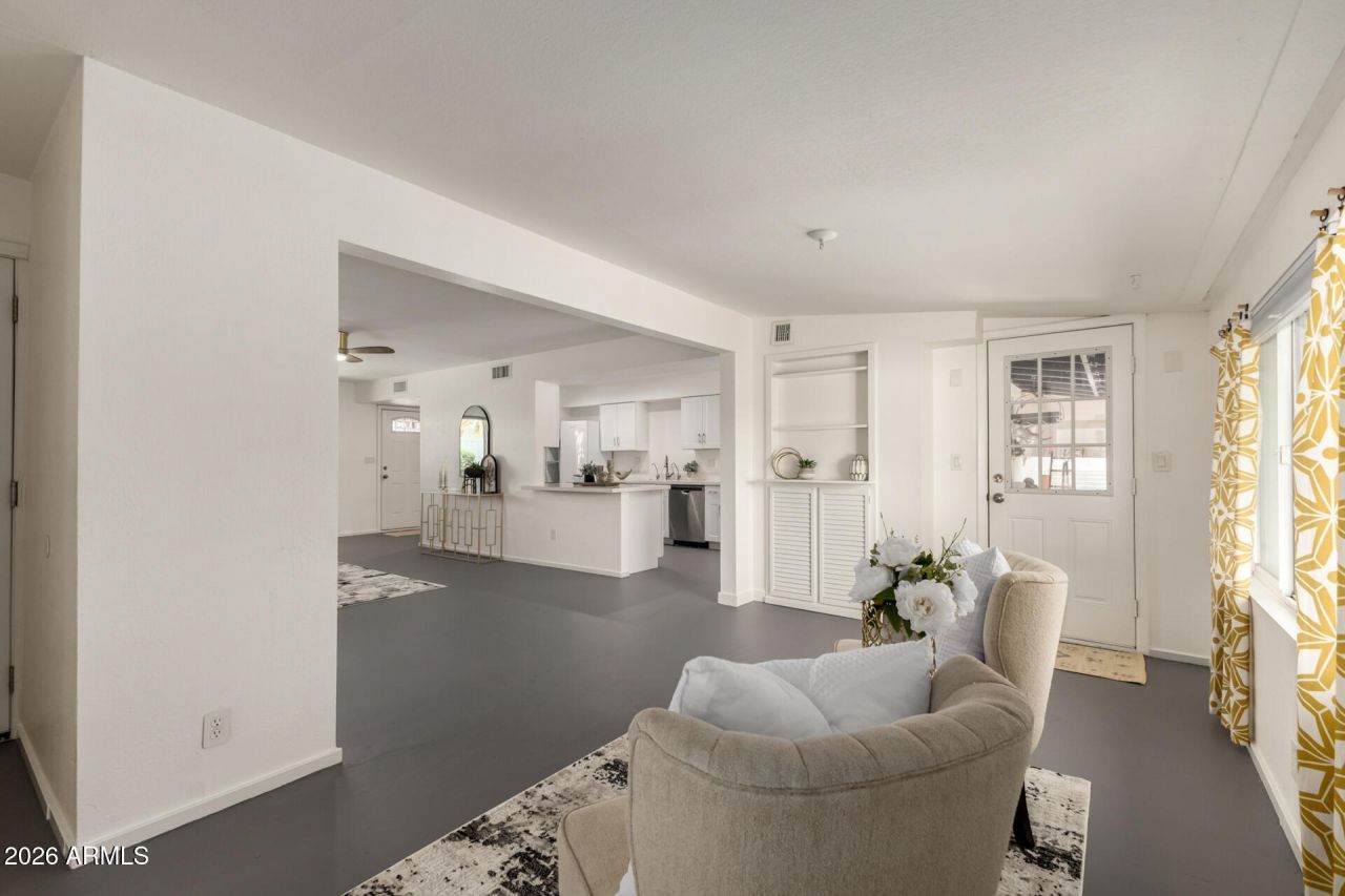 NEWLY RENOVATED IN MARCH! MUST SEE BACKYARD OASIS! This STUNNING mid century home has all the luxuries you are looking for! Step inside to beautiful updates including stylish, maintenance free concrete floors, tons of natural light, and neutral colors that work great with any choice of decor. The galley-style kitchen features recessed lighting, shaker cabinets, quartz countertops, and built-in appliances for a seamless cooking experience. Extra large primary bedroom with en-suite features dual sinks! This back yard is AMAZING! Get ready for weekend grills and peaceful evenings in the absolutely beautiful landscaped backyard, complete with a covered patio, serene ponds, even a small chlorinated pool for dipping in, artificial grass, and fantastic golf course views and incredible sunsets. Upgrades and Features in this mid-century modern home include:-Modern finishes throughout -Low maintenance painted concrete floors -Newer kitchen - quartz countertops, cabinets, and appliances -Includes washer, dryer, and refrigerator -Insulated garage door for energy efficiency-Extended length garage for enhanced parking -Roof replaced 5 years ago-New A/C and heating system -New water heater -Reverse osmosis and full-house water filtration system -Double vanity in remodeled bathrooms -Situated on the golf course with great sunset views -Five self-cleaning ponds - unique, tranquil outdoor setting. One of them is chlorinated to be used as a dipping pool-Low-maintenance desert landscaping with timer-controlled irrigation system-Outdoor lighting & seating areas for entertaining -Covered patio & hammock space for relaxation -Close to shopping, dining, and conveniences and freeway