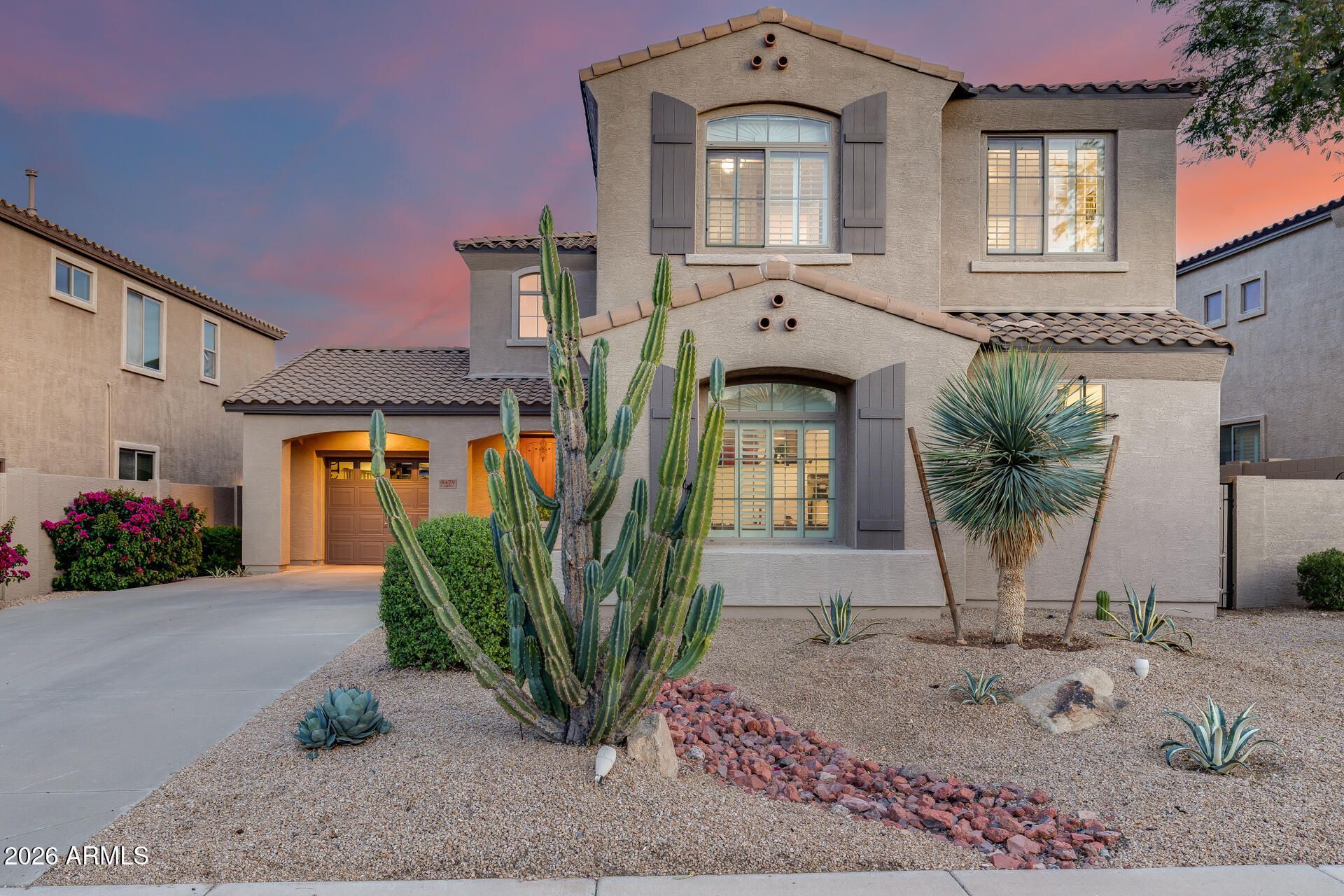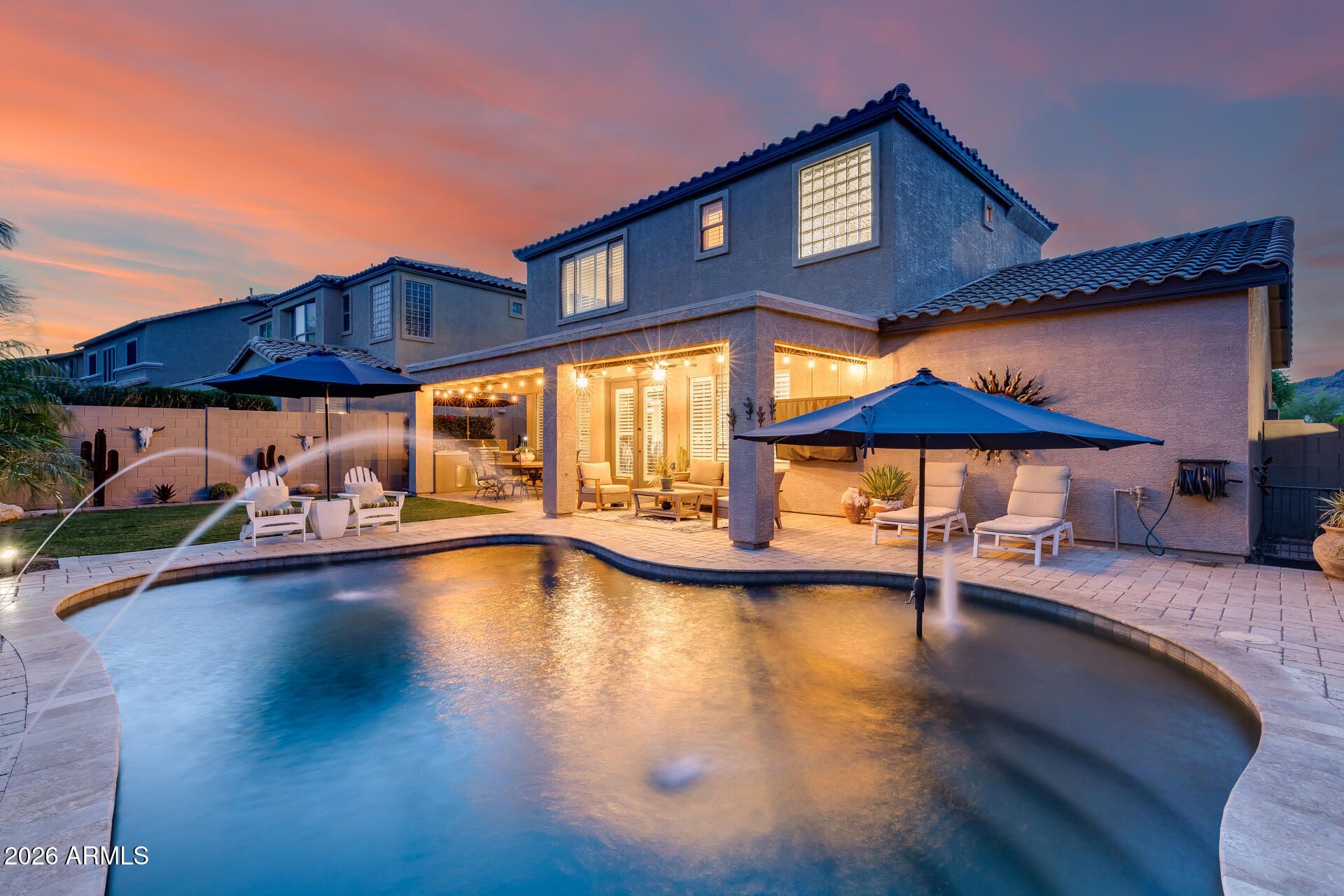 Spacious Living in an Unbeatable WestWing Location! This stunning 2,211 SF home offers 3 bedrooms and 2.5 baths with a bright, open layout, soaring ceilings, neutral tones, and brand-new plantation shutters throughout. The kitchen features granite countertops, an undermount sink, staggered cabinetry, a breakfast bar, and pantry. It opens to the dining area and cozy family room with a gas fireplace and backyard views, perfect for everyday living and entertaining. Upstairs includes generously sized bedrooms, a versatile loft, and mountain views from every room. The spacious primary suite offers a walk-in closet, dual sinks, soaking tub, and separate shower. Step outside to your private desert oasis with a heated pool, view fencing, and a large covered patio with ceiling fans and a built-in BBQ, ideal for Arizona evenings. Additional highlights include a 3-car garage and a large lot in the sought-after WestWing community, near top-rated schools, parks, and hiking trails.