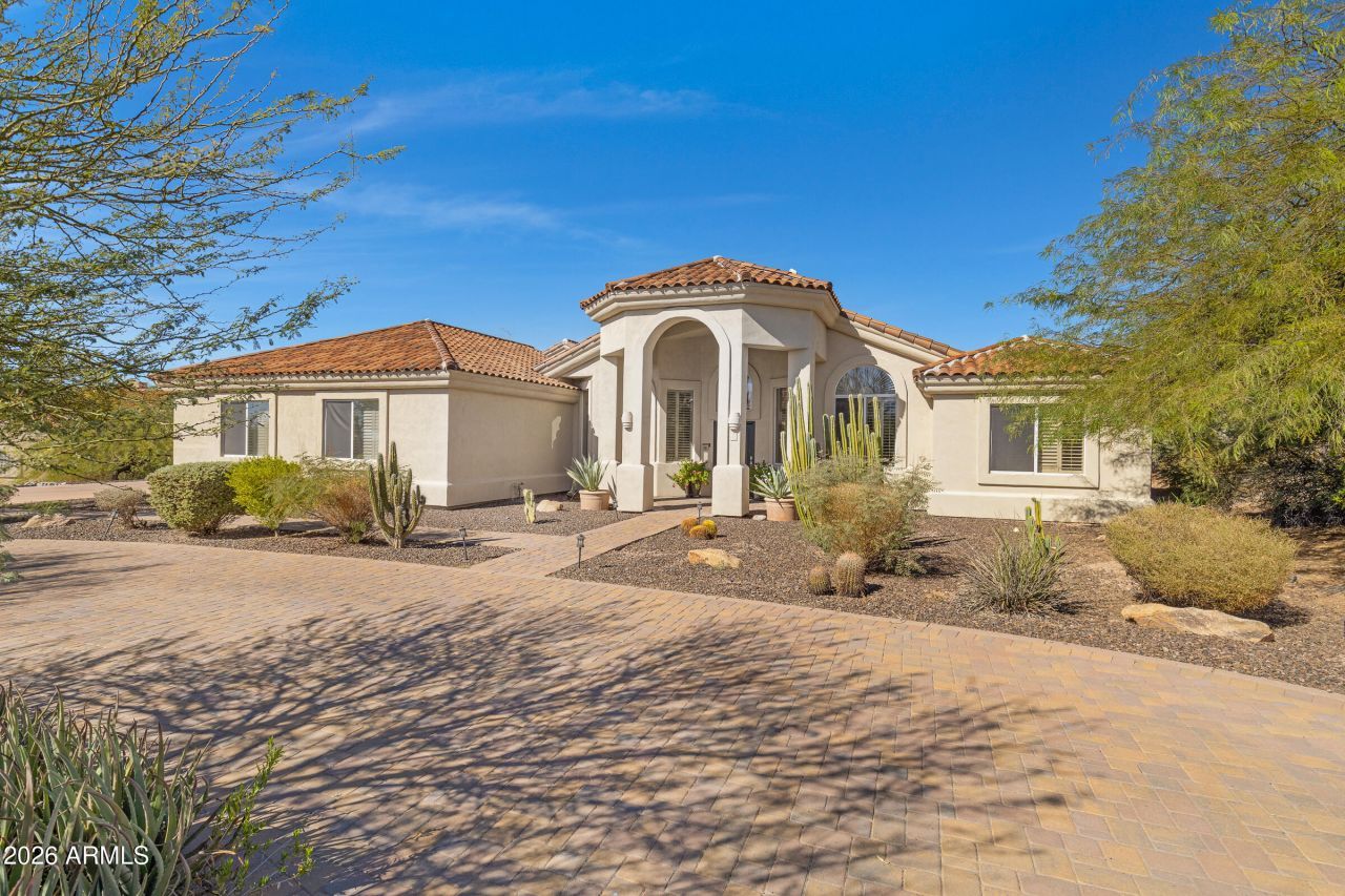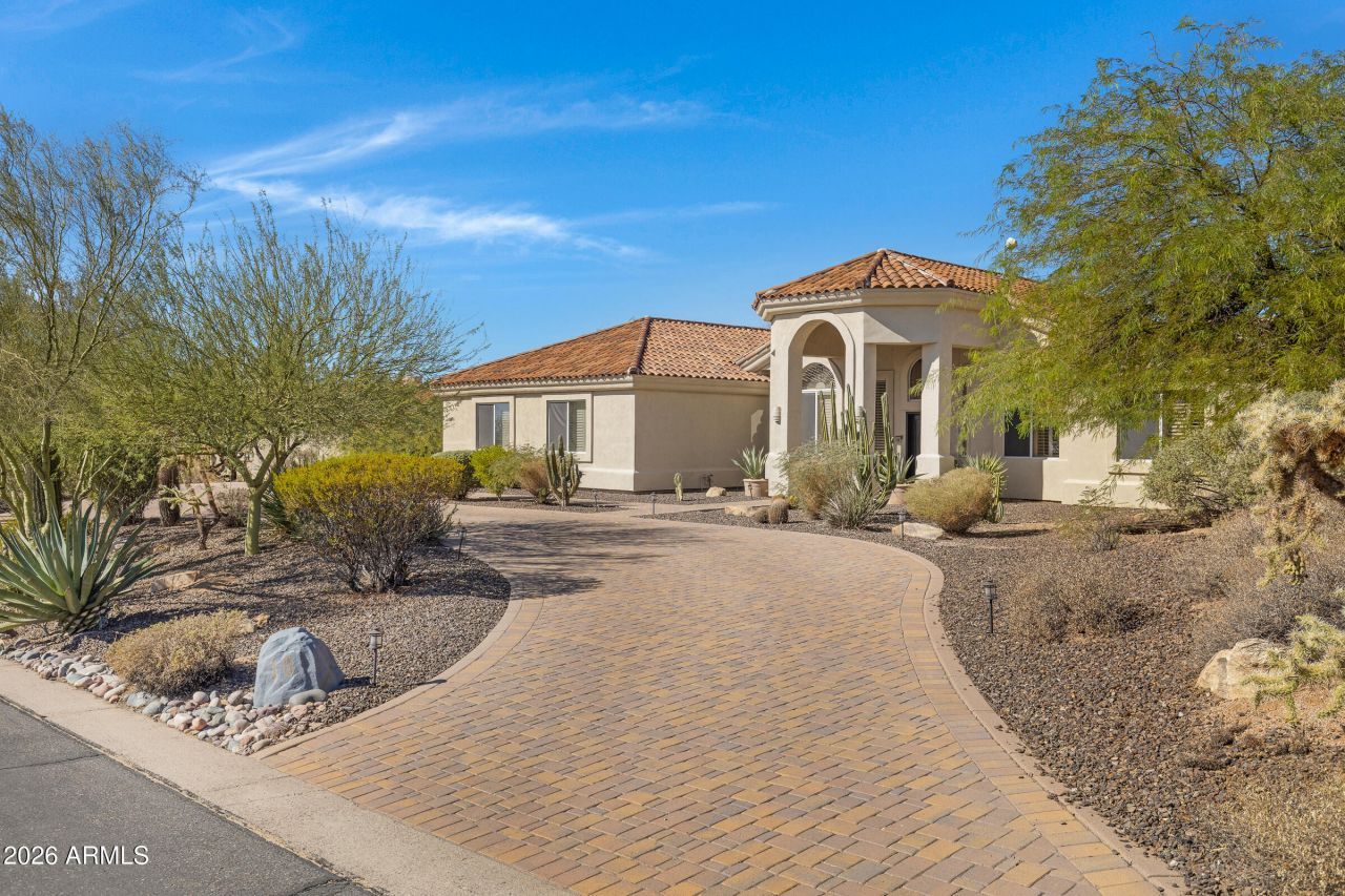 You dont want to miss out on this beautiful custom built home in the quiet and serene neighborhood of Thunder Mountain. One of Mesas most highly regarded, sought after, peaceful and private, low traffic, gated communities. The large .8 acre lot provides breathtaking views and wide open space. A grand circular driveway leads you to an arched/covered entryway. As soon as you enter the home you get a sense of light, flow and calm with an open, airy floor plan. Wide hallways allow for easy, carefree movement throughout the home. Your first impression inside the home is a spacious formal living room/great room and formal dining room with 15 foot vaulted ceilings, a convenient wet bar and French doors that lead to the outside entertainment space. The large chefs custom kitchen has custom backsplash, an abundance of counter space with breakfast bar, built in custom cabinetry, walk in panty and desk area. Complete your gourmet meals on a Thor gas stove top and other new/upgraded appliances. Spacious family room with fireplace extends smoothly from the kitchen with easy access to outside entertainment space through French doors. Primary suite has a sitting room, two walk in closets, electric fireplace and an exit to the luxury backyard. Primary bath has a jetted tub, large walk in shower and double sinks. Split floor plan includes three other bedrooms and two bathrooms. Two bedrooms and one bath are Jack and Jill. One with electric fireplace. Entertaining is elegant and tranquil in the back of house courtyard with bubbling water feature. Drink and dine under the adjacent covered patio. The mountain views from here are spectacular.The backyard is a peaceful getaway with a sparkling pool, BBQ with eating bar, Fire pit, finished pavers and continued luxurious mountain views. Extended/oversized three car garage has built in cabinets and epoxy flooring.Wood plantation shutters throughout. Newer HVACs and water heater. 24 owned solar panels reduce your electric bill. Thunder Mountain is removed from the city hustle and bustle but it has all the conveniences nearby. Usery Mountain Park is ideal for hiking, biking, and nature walks. Saguaro Lake and its restaurant, Rio Salado Shooting Range, and Tonto National Forest and endless desert recreation are just minutes away. Easy access to freeways, less than 1/2 hour from Sky Harbor Intl Airport and Scottsdale.Thunder Mountain has pickleball courts, tennis courts, a ramada with BBQ grills and a childrens play area.