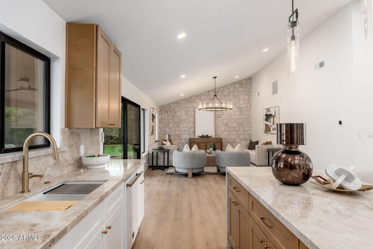 Beautifully remodeled single-story home in the highly sought-after McCormick Ranch community, featuring high-end finishes, contemporary design, and a sparkling swimming pool. The completely upgraded kitchen showcases Forno appliances, two-tone shaker cabinetry, quartz countertops, and a large breakfast bar. Vaulted ceilings, a skylight, recessed lighting, and vinyl wood flooring create a bright, open flow throughout the home. The bathrooms are thoughtfully updated with premium shower systems, custom vanities, framed mirrors, and designer tile niches. Step outside to an expansive covered paver patio with a built-in adobe fireplace and dedicated seating area overlooking the sparkling pool???perfect for enjoying Arizona days and evenings year-round.