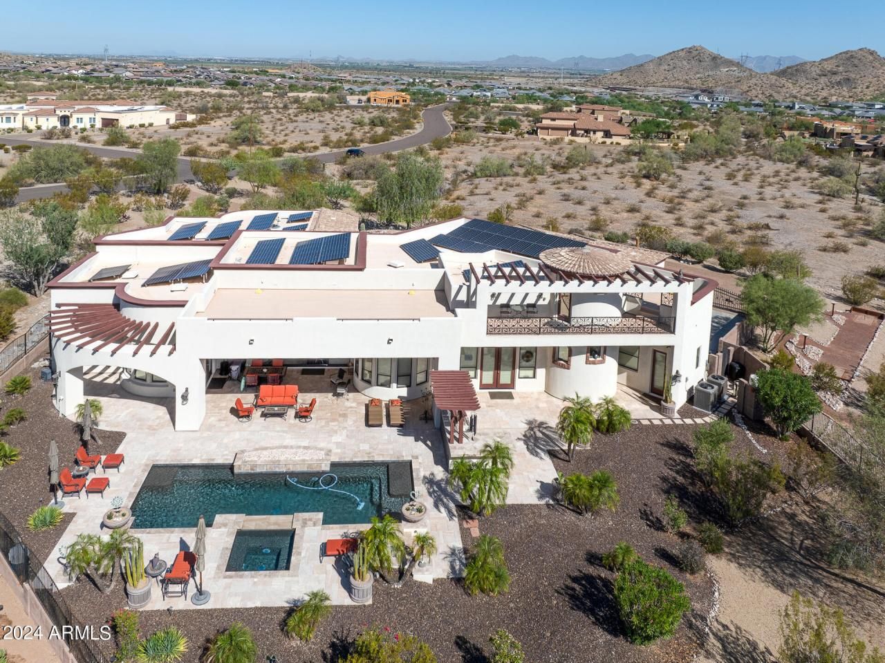 Imagine, Estrellas finest, Custom Retreat, stargazing in your Cascading Waterfall, Saltwater Pool ~ Spa, Resort Backyard: Outdoor Kitchen, Travertine Covered Patio encompassing Panoramic Views w 2 Rooftop Decks! Breathtaking Courtyard entry adorned with Stone Fountain. Stunning Architecture, Exquisite Lighting & Chefs Kitchen boasts Custom Cabinetry, Thermador Appliances, Pot filler, 6 Burner Gas Cooktop w/ Griddle, Gorgeous Granite & Huge Island. Flooring w/ Inlaid Tile, Crystal Chandeliers, Central Vac, 3 Gas Fireplaces, Surround Sound. Primary En-Suite adorned with Luxurious Spa Bath. Thermador Espresso Machine. Designer Secondary Baths w/ Vessel Sinks, Gold Plated Faucets! Surround Sound. Incredible Custom Home located in the Summit of Estrella Mountain Ranch Consisting of 4 bedrooms, 4.5 baths, large office with fireplace, game room with wet bar. 2 roof top decks along with huge windows throughout the house provide breathtaking mountain views from every angle. Paved private drive with ample parking. Custom ironwork & lighting - gorgeous entry w/courtyard & stone fountain. Beautiful woodwork -Chefs Kitchen w/custom cabinetry & built-in Thermador appliances, pot filler, 6 burner gas cooktop w/ griddle, Level 6 granite, huge island. Remarkable flooring w/ inlaid tile - Luxurious spa master bath with jetted tub / built-in-media controls & Thermador espresso machine. Designer secondary baths w/ vessel sinks - central vac, 3 gas fireplaces, surround sound throughout. Spectacular Saltwater pool w/ spa & waterfall. Spacious covered patios w/ Travertine flooring & pool decking, built-in BBQ All of this within the exciting community of Estrella Mountain Ranch with its 72 acres of lakes, 3,000 sq ft fitness center overlooking the 12,000 sq ft water-park with water slides and heated lap pool. Estrella Mountain residents enjoy over 40 acres of parks that include pathways, pavilions, an amphitheater, basketball, tennis, pickle-ball and volleyball courts. On the lake north lake is the Yacht Club that offers sailboats, paddle boats, canoes, and kayaks. Over 50 miles of hiking and well-designed mountain biking trails. Estrella is also home to a par-72, 18-hole championship golf course designed by award-winning Nicklaus Design.