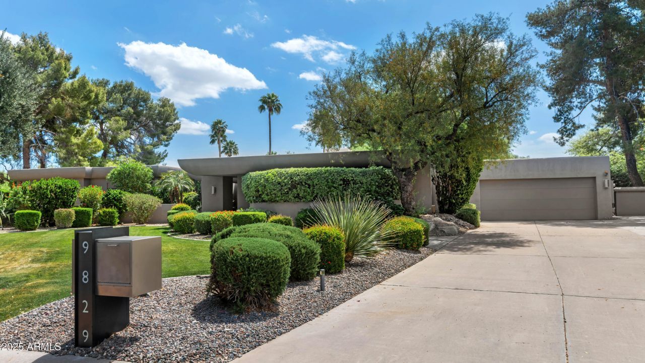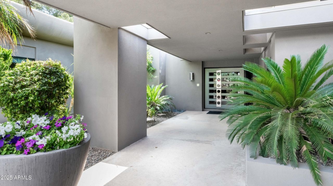 Welcome to this exceptional home, a true architectural gem, originally designed by world-famous Taliesin Architects and reimagined in 2005 as a tribute to the legendary Frank Lloyd Wright. Taken down to the studs and thoughtfully expanded, this residence was transformed to offer an open and functional floor plan, perfect for modern living. From the moment you arrive, youre greeted by a true work of art???the custom hammered steel pivot front door sets the tone for the craftsmanship found throughout the home. Step inside and youll be welcomed by soaring ceilings and celestial windows that bathe the interior in natural light.The spacious layout includes two distinct living areas, offering flexibility and comfort, plus a dining area ideally situated just off the kitchen. A chefs dream, the kitchen features sleek stainless steel Wolf & Sub-Zero appliances, multiple ovens, a warming drawer, a large walk-in pantry with a wine fridge, Poggenpohl cabinetry and plenty of space to gather and create.On one wing of the home, youll find three generously sized bedrooms, with walk in closets, and two beautifully appointed bathrooms. On the other side, the primary suite is a private retreat with a large sliding glass door, built-in bookcase, and a spa-like bathroom featuring honed slate floors, granite countertops, custom cherry wood cabinetry, a jetted tub, steam shower, and a spacious walk-in closet.Additional highlights include a large office with custom-made Herman Miller casegoods designed for the room and a dedicated workout room & flex room ideal for those who work or train from home.Step outside to your own private oasis - lush, mature landscaping surrounds a diving pool, a sport court, and one of the most beautiful mesquite trees youll ever see. The covered patio features a pass-through window to the kitchen, a misting system for comfort, and ample space to entertain or unwind.Located in Mountain View Estates, a secluded enclave of just 56 homes, this property offers both privacy and convenience, close to top restaurants, shopping, and more. This property is truly a one-of-a-kind home in an unbeatable location.