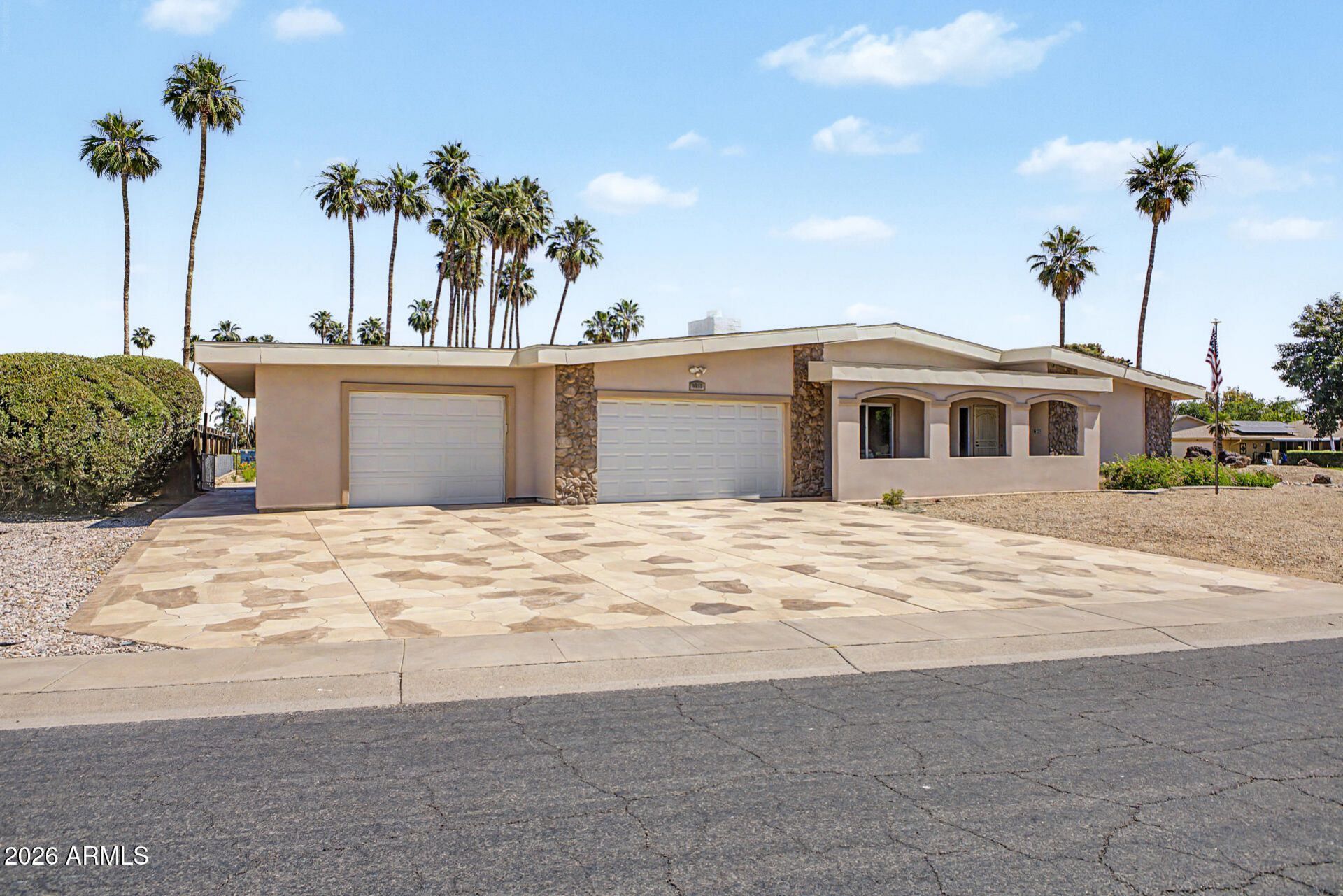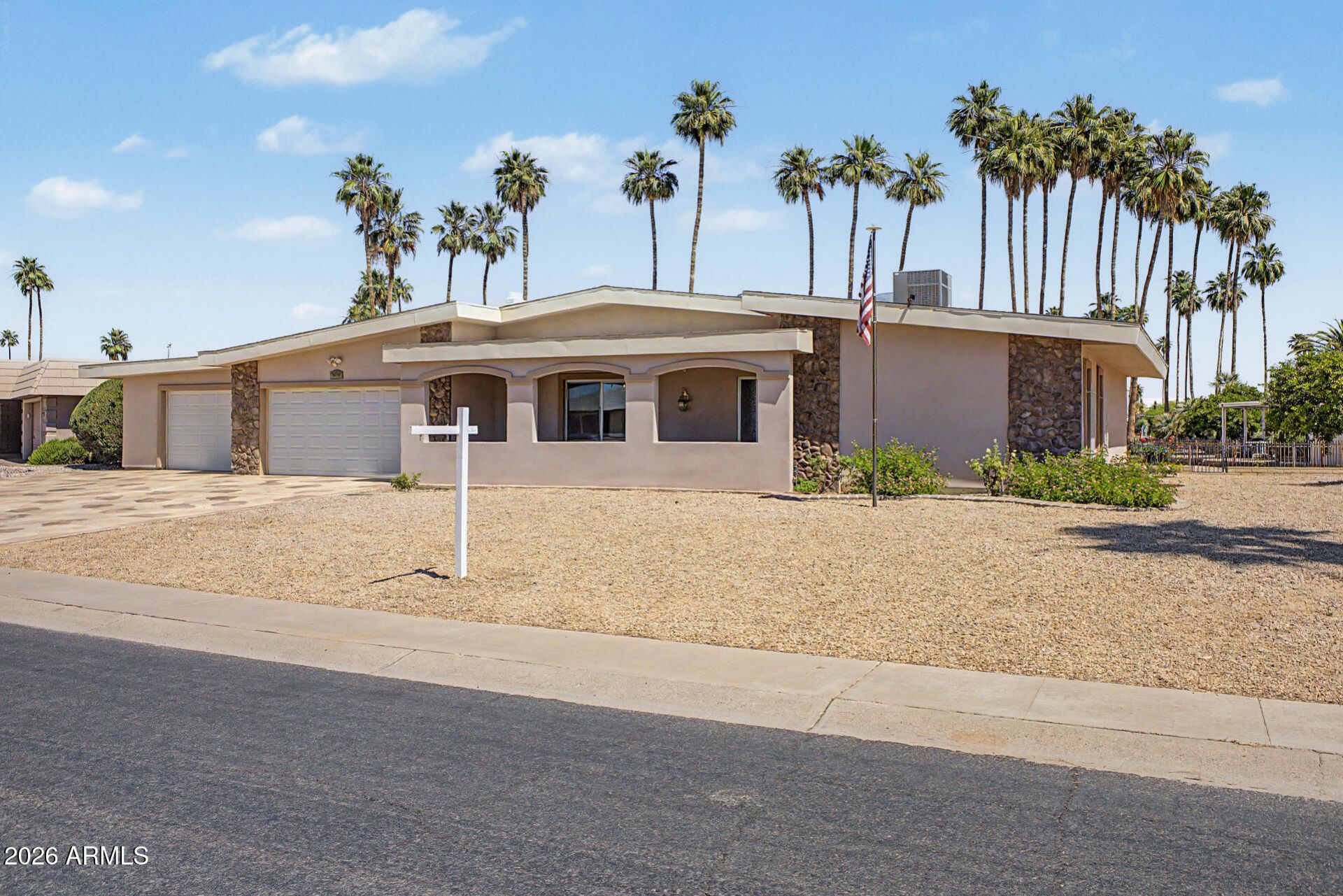 Welcome to one of Sun Citys most coveted hidden treasures: Dawn Lake. This exceptional lakefront property has been completely reimagined to offer the perfect blend of luxury, comfort, and active adult living. Set on a sprawling corner lot, the home features a resort-style pool and a massive three-car garage, delivering both elegance and outstanding functionality. This upgraded 2-bedroom, 2-bath residence is ideal for those seeking breathtaking scenery, peaceful privacy, and a vibrant lifestyle. The premium waterfront setting captures sweeping views of the lake, palm trees, and distant mountains--creating a stunning backdrop from sunrise to sunset. A private dock invites quiet mornings by the water and unforgettable evenings with shimmering reflections and serene surroundings. The expansive lot provides endless potential for outdoor living and future enhancements, while the pool transforms the backyard into a private oasis perfect for relaxing or entertaining under the Arizona sun. Inside, the home offers a bright, open layout with effortless flow between living spaces. Thoughtful touches, and low-maintenance landscaping, add charm and ease to everyday living. The oversized three-car garage offers abundant space for vehicles, storage, and a golf cart--making it easy to enjoy Sun Citys extensive golf cart pathways and nearby amenities.Dawn Lake is more than a neighborhood--its a lifestyle. Residents enjoy a close-knit community with social events, recreation, and convenient access to shopping, dining, golf, and more. This is more than a home--its a sanctuary. A rare opportunity to enjoy lakefront living with space, style, and the very best of Arizona beauty.