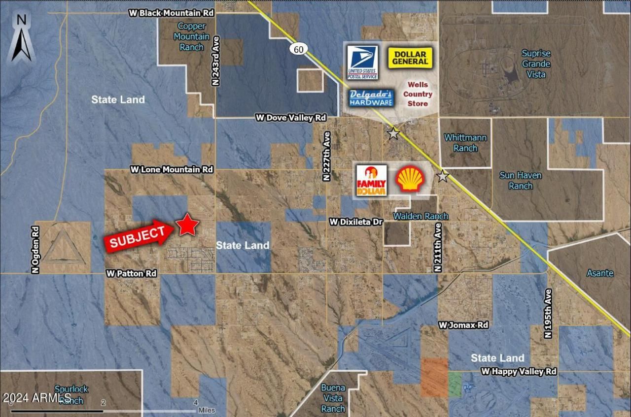 ???Excellent opportunity located in the direct path of growth.???Ideal for Industrial and Commercial uses, with unique ability to provide auxiliary services to the near by BNSF logistics park.???Situated just off Patton Road, this site benefits from easy accessibility as well as privacy with state land neighboring directly to the North.???Located just East of 255th Ave, this property will also be a main beneficiary of the proposed Wild Rose Parkway- A major North/South arterial that will connect the Sun Valley Parkway to the US-60.???With zero floodplain impact and minimal holding costs, this site is poised for success.