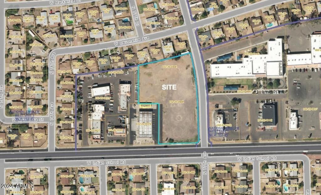 Commercial land available for sale at the NWC of 77th Ave & Indian School Rd in Phoenix, AZ. This 2.28 acre vacant lot has frontage along Indian School Rd with a traffic count of almost 30,000 VPD. The property is surrounded by business and retail amenities and is about 20 minutes from downtown Phoenix.