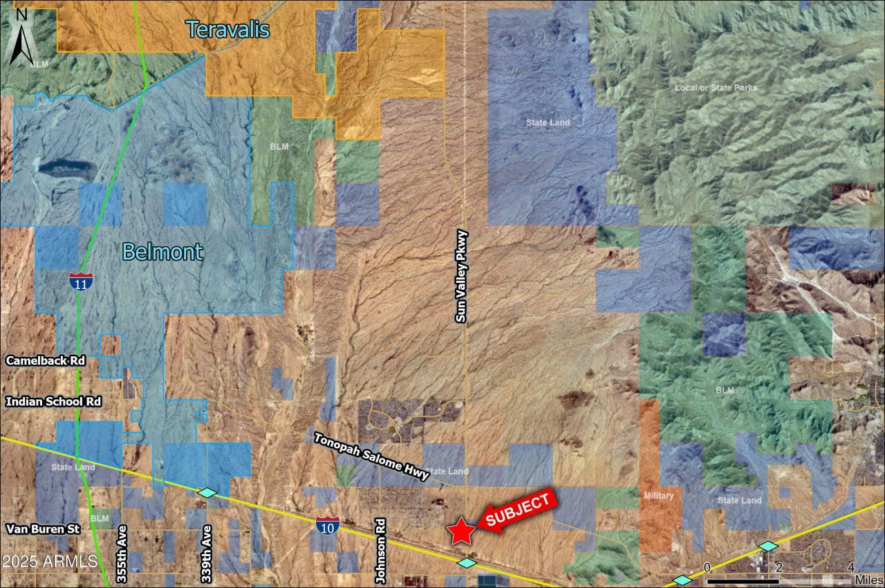 Excellent opportunity to develop commercial space in a vastly underserved part of West Buckeye.Ability to exclusively serve the entire local population, including the sold out 2,918 lot Tartesso Community to the North, the 336 lot West Phoenix Estates community to the West, as well as the incoming 100,000 home Teravalis community, whos residents will all access their homes via the Sun Valley Pkwy. As of today, the entire existing local population (approximately10,000 people) travel to I-10 & Watson for the nearest commercial service.Teravalis, formerly known as Douglas Ranch, began construction on 10/28/2022 and will reportedly create 1.5 jobs for every home.
